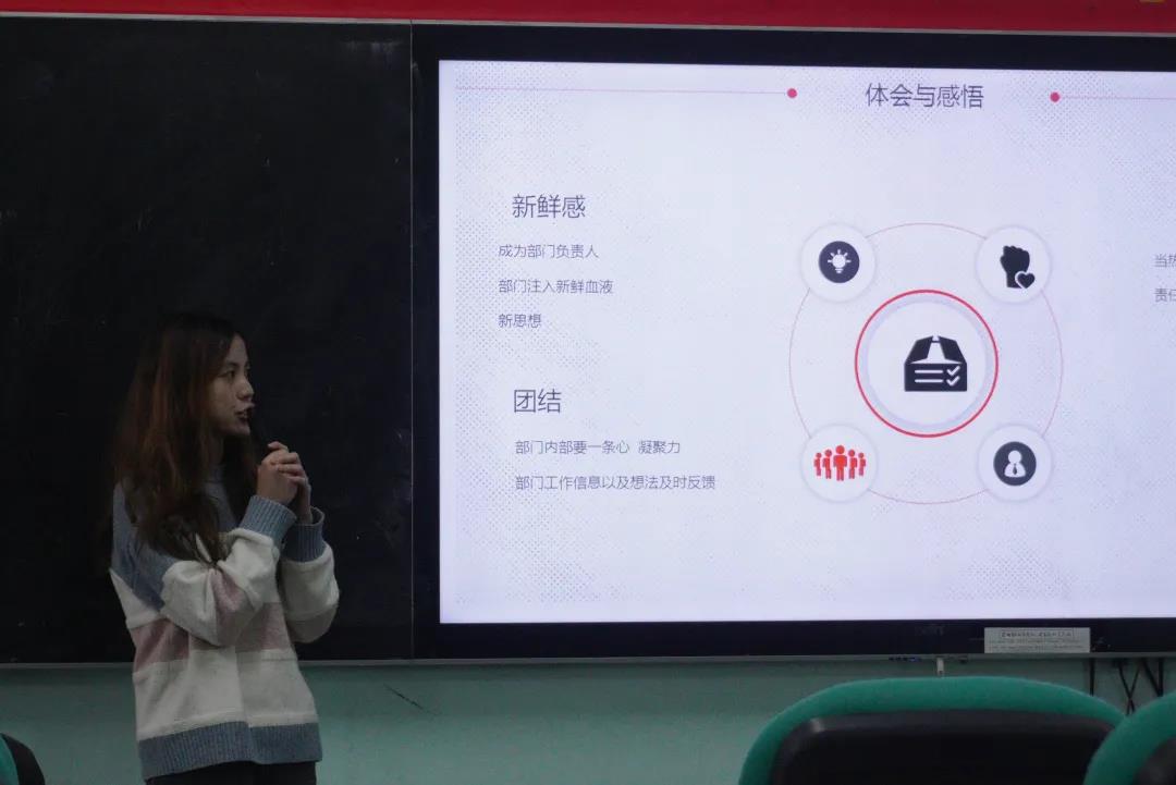 会上,团委学生会各部门负责人、学生党建办公室负责人、学院新闻媒体中心负责人和主席团成员分别对本学期的工作进行汇报,着重对过去一个学期的工作进行了总结反思,并对未来工作提前做好计划。随后,潘老师为学院干事培训中的获奖小组代表进行颁奖。最后,陈老师作了总结,他肯定了团委学生会等的相关学生干部在学院工作中的付出,并表示此次述职不仅是对过去工作的反思,更是为了更好地完成后面的工作。