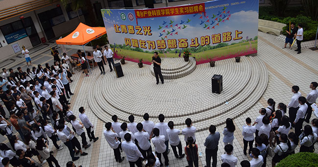 学生实习招聘会在莞城校区实验楼中庭举行,此次招聘会共有35家企业参加,提供了600多个实习岗位,覆盖技术、营销、行政等类型,满足工业设计、金融、多媒体、电商、机械及自动化等专业的需求。