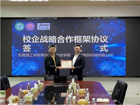 与东莞信易电热机械有限公司在学院举行签约仪式,双方签订为期三年的校企战略合作框架协议,并为公司总经理吴峻睿颁发业界导师聘书。院长陈伟、教务长黄灯奎、教务办主任陈尚彦出席签约仪式。