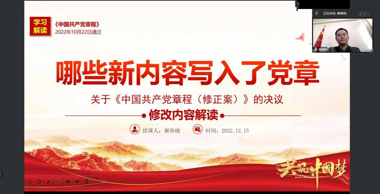 课上,学院党委副书记谢春晓老师为同学们解读了关于《中国共产党章程(修正案)》的决议相关修改内容。谢副书记围绕“党的二十大对《中国共产党章程》作出了哪些修改”以及发展的历史进程”两个主题讲授。他详细解读了《中国共产党章程》修改的内容及其意义内涵,加深了大家对十九大以来党的理论创新、实践创新、制度创新成果的认识和把握。最后,谢副书记总结列出了学习的关键词汇,敦促同学们自觉学习并深刻领会内涵,坚定自身理想信念、强化自身政治意识。