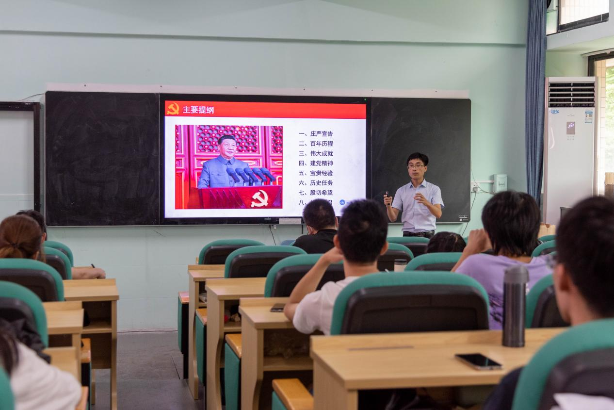 师生作习近平总书记在庆祝中国共产党成立100周年大会上重要讲话精神专题宣讲。学院党支部书记宋美娴、院长陈伟、全体教职工、学生党员及入党积极分子参加了宣讲会。宣讲会由学院党支部书记宋美娴主持。