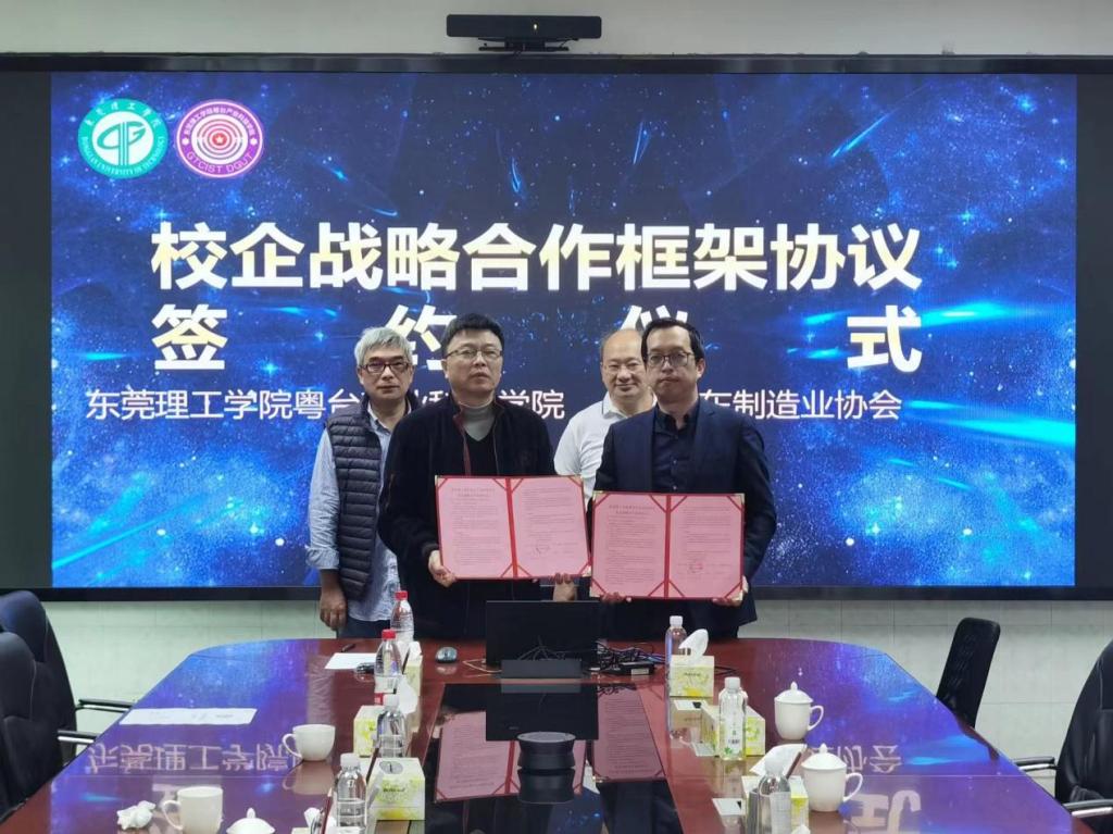 与广东省制造业协会在学院会议室302举行签约仪式,双方签订为期三年的校企战略合作框架协议。院长陈伟、教务长黄灯奎、教务办主任陈尚彦、广东省制造业协会秘书长殷晓斌出席签约仪式。