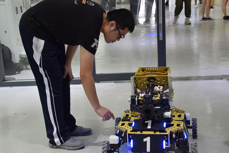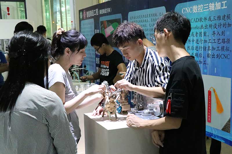 学生占比约50%,现场演绎了RoboMaster国际大赛机器人组合的场面。还展示了具有多重复杂组合构建的智能避障小车、指尖陀螺、十二兽首仿真模型、步行机器人等产品。