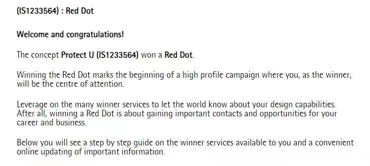 “红点奖”与德国“IF奖”、美国“IDEA奖”并称为世界三大设计奖。由欧洲最富声望的著名设计协会(Design Zentrum Nordrhein Westfalen)于1955年在德国城市埃森 (Essen)设立。 “红点奖”以"促进环境和人类和谐的设计"为理念,涵盖了多种产品和传达设计,其竞赛项目则由产品设计、传达设计和概念设计三个部分组成,被公认为国际性创意和设计的认可标志,获奖作品还将得到最大范围的推广和认可。因此,赢得红点奖是全球每位设计师梦寐以求的荣誉。