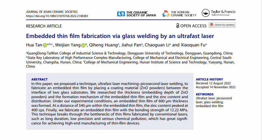 智能制造工程专业2020级本科生杨伟健,在谭华老师的指导下,以第二作者身份在高水平期刊Journal of Asian Ceramic Societies发表中科院二区SCI论文Embedded thin film fabrication via glass welding by an ultrafast laser。