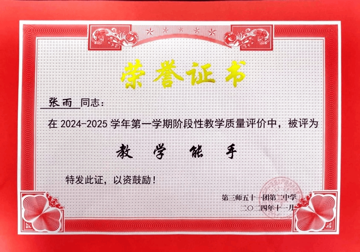 援疆支教队员,2022级计算机科学与技术(跨境电商)专业张雨同学在第三师五十一团二中2024-2025学年第一学期阶段性教学质量评价中,荣获教学能手称号,是我校本次援疆支教队员中唯一获得此荣誉的队员。